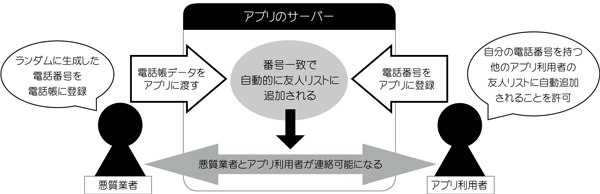 図3のように、このアプリを利用したいユーザーは、まず自分の電話番号等を登録する。電話番号は公開されないが、アプリ側のサーバーでは電話番号に紐(ひも)づける形でユーザー登録がなされる。その上で、自分のスマートフォン等に登録している電話帳データをアプリ側に渡すことを許可すると、その電話帳から同じアプリを利用している人を見つけ、その人を友人リストに登録し、アプリを通して連絡をとることができる。