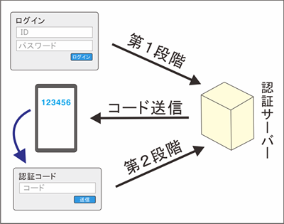 2段階認証は、IDとパスワードを使った従来のログイン手順に、もう1段階、毎回変わる「認証コード」の入力を加えたものだ。2段階認証を使うと、ログインは図3のような手順になる。