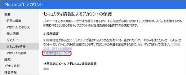 2段階認証を設定するMicrosoftアカウントでログイン(サインイン)する。ページ右上のユーザー名をクリックし、[アカウント設定]をクリックしてアカウント設定ページを開く。ページ左のリストにある「セキュリティ情報」をクリックして、「セキュリティ情報によるアカウントの保護」ページを開く。