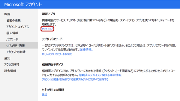 認証コード生成アプリを使用する場合には、「セキュリティ情報によるアカウントの保護」ページの「認証アプリ」の欄にある「セットアップ」をクリックする。