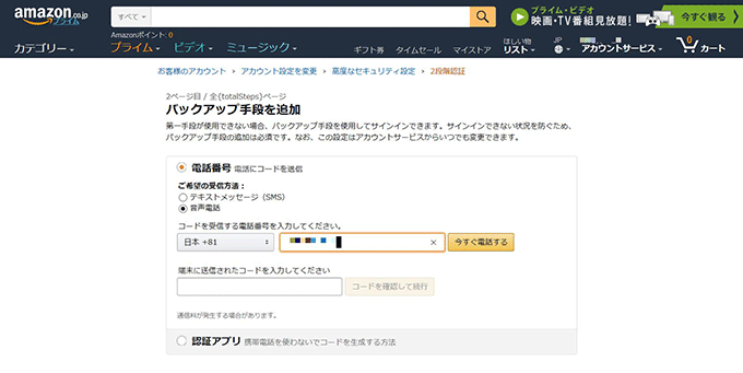 今回2段階認証についてご紹介したAmazonの場合には、2段階認証の設定手順の中にこの設定が組み込まれており、別の電話番号か認証アプリをバックアップ手段として登録することが必須となっている。