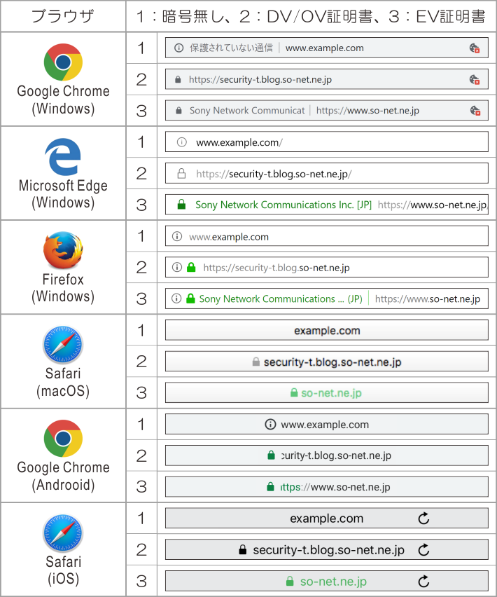 サーバー証明書と各ブラウザのアドレスバーの表示を図1にまとめました。利用しているブラウザのアドレスバーが、どのように変化するのかを把握しておきましょう。